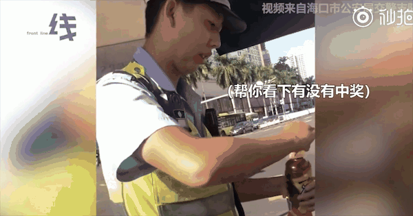 交警叔叔便接過飲料瓶幫她開蓋
