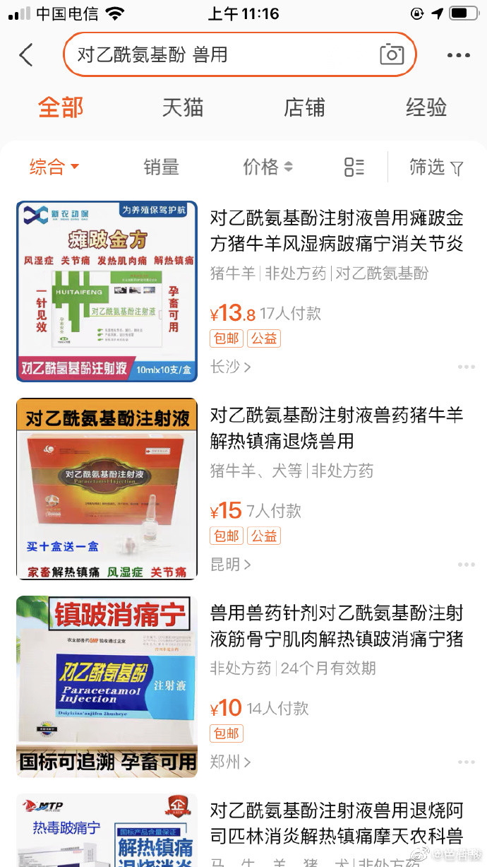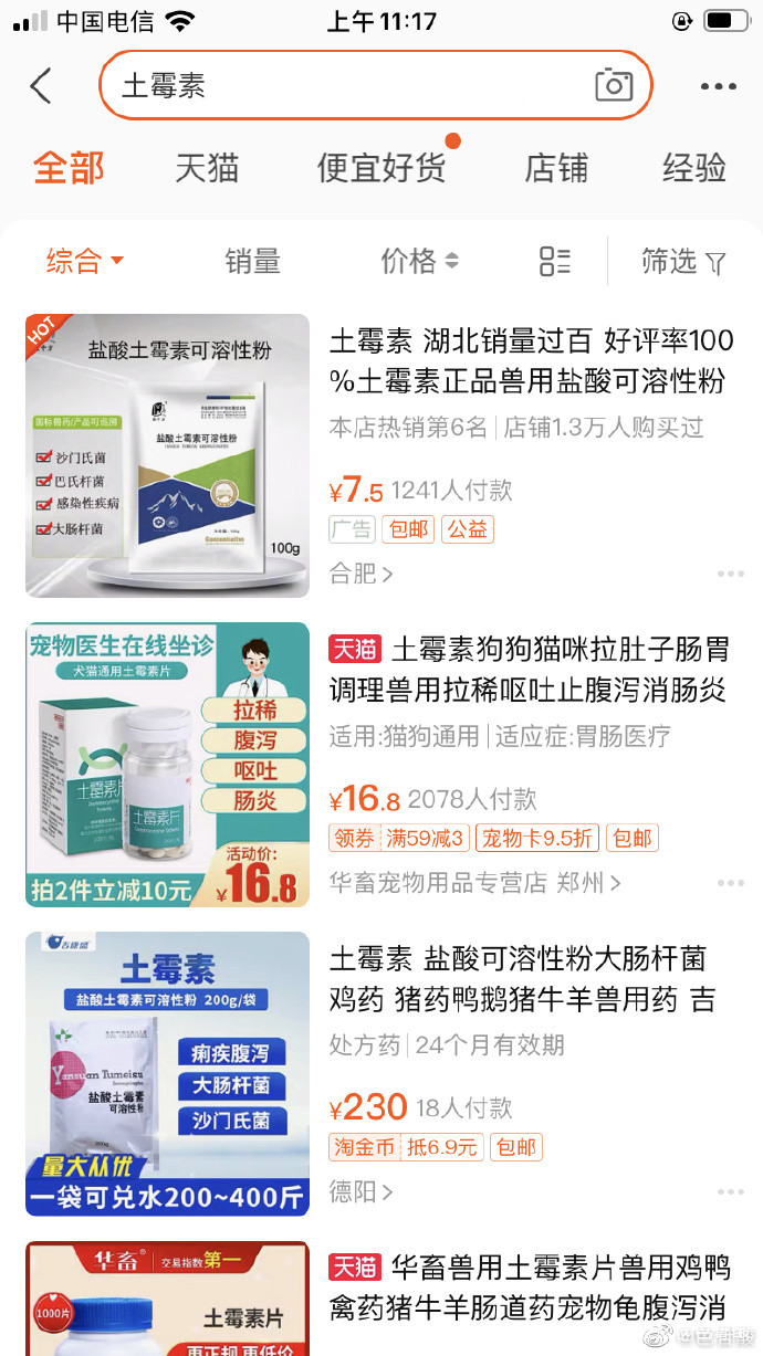 實際上,中國生產的藥物總量只有一小部分用在了人的身上,多出的藥物一部分是動物用藥,一部分是原料藥物(包括出口)。我隨手在某寶上搜索了一下,搜出一大堆獸用藥粉,注意,這些計量單位都是公斤。如果是購買原料藥物,則計量單位是以噸來計算的。