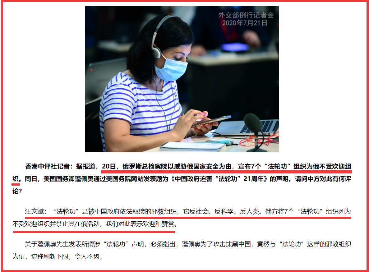 據外交部網站,在21的外交部例行記者會上,香港中評社記者提問:據報道,**20日,俄羅斯總檢察院以威脅俄國家安全為由,宣佈7個“法輪功”組織為俄不受歡迎組織。**同日,美國國務卿蓬佩奧通過美國務院網站發表題為《中國政府迫害“法輪功”21週年》的聲明。請問中方對此有何評論?