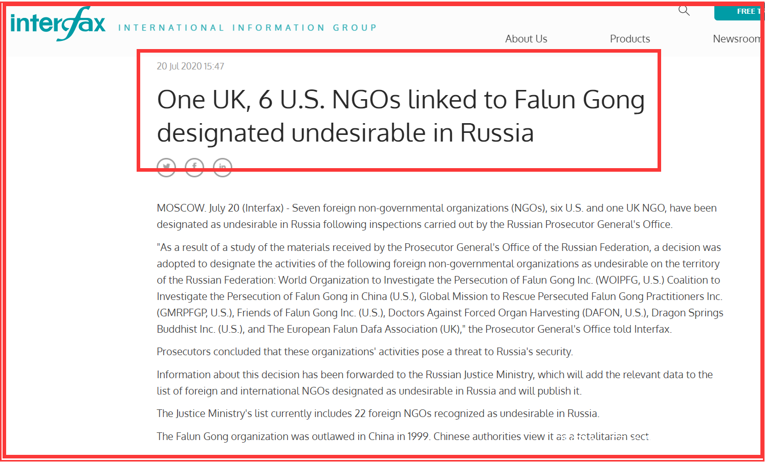 據俄羅斯國際文傳電訊社7月20日消息,經俄羅斯檢察長辦公室研究確定,法輪功所屬7個在俄非政府組織(NGO),其中6個屬美國和一個屬英國,被認定為在俄羅斯不受歡迎的組織。