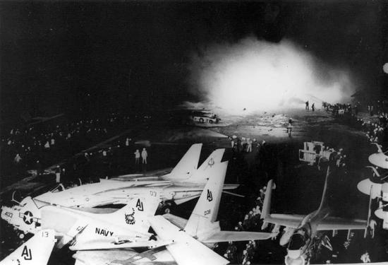 1981年5月26日,“尼米茲”號航空母艦在佛羅里達北部海域進行夜間訓練的時候,一架EA-6B電子戰飛機在降落的時候突然向右側漂移,它分別撞上了1架SH-3直升機、3架A-7E攻擊機、3架F-14戰鬥機以及一輛牽引車。這架EA-6B在撞擊的過程中發生爆炸,大火持續了半個小時,“尼米茲”號的前甲板被燒的一塌糊塗。