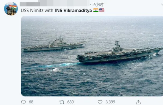 報道稱美印兩軍將在安達曼-尼科巴羣島進行聯合軍演。就在美軍航母還在路上的時候,印度網友竟然已經曬出了印度海軍“維克拉瑪蒂亞”號和“尼米茲”號的合影,不知道的還以為印度遠接高迎把自家航母開到了馬六甲海峽。