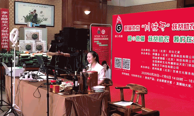 這一句又一句正在讓我們摸不着頭腦,突然音樂響起,一個清脆的嗓音開始唱起來,我們第一反應肯定是餐廳放的音樂,哪料轉頭就看到,一個紅色背景板前,一個姑娘——正在舉着麥克風唱歌!在她面前,架着補光燈和手機,沒錯,她在直播!紅色背景板上寫着:首屆北京“川妹子”扶貧助農公益直播。