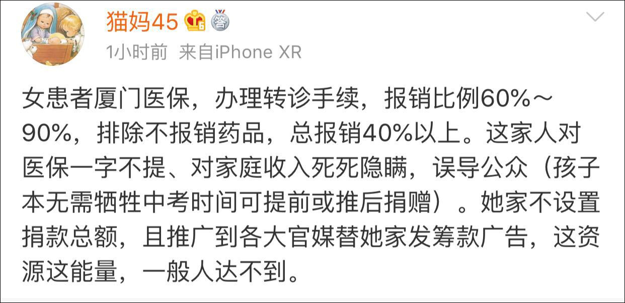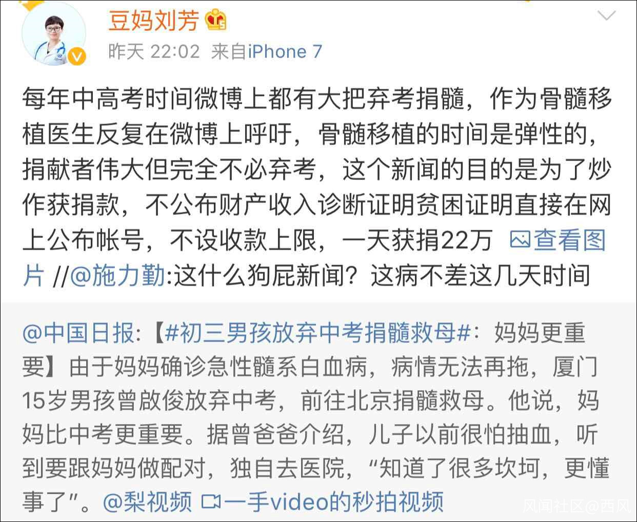 每年中高考都有大把棄考捐髓,作為骨髓移植醫生呼籲,骨髄移植時間是彈性的,有其他的可選方案避開考試時間,捐獻者偉大但不必棄考,“這新聞是炒作獲捐款,不公佈財產收入診斷貧困證明直接在網上公佈帳號,不設收款上限,一天獲捐22萬。”