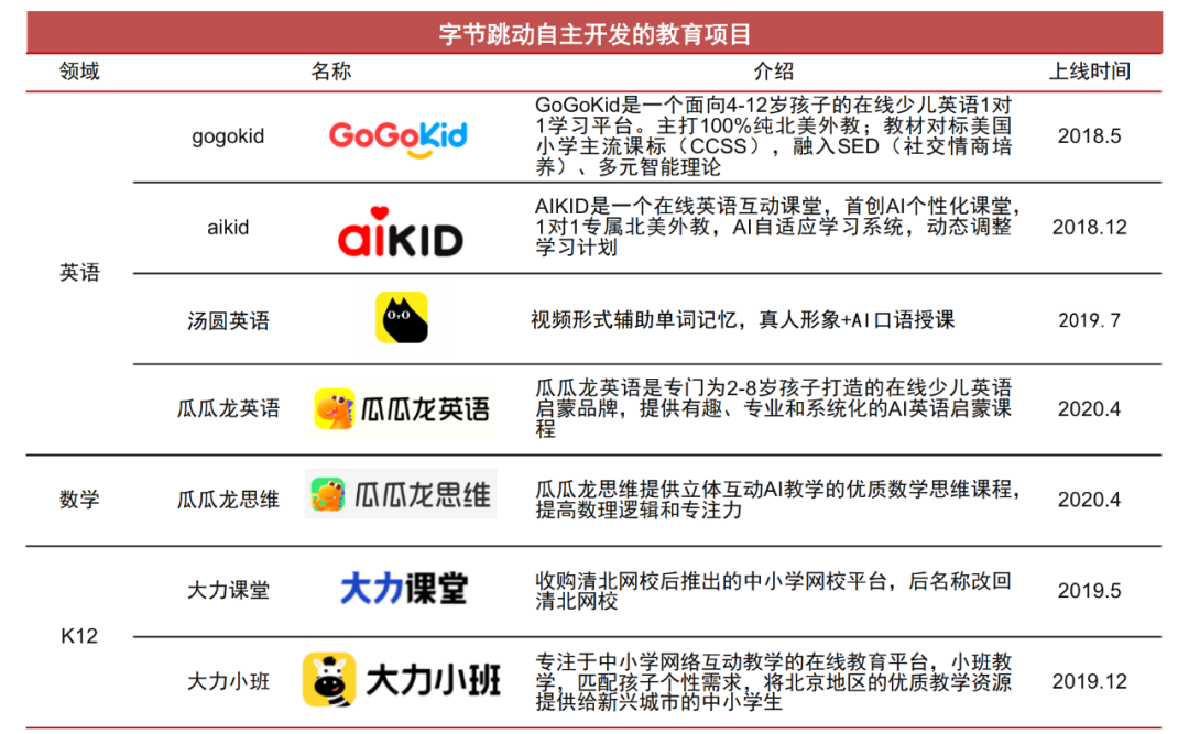 相比於流量焦慮的在線教育企業,佔據流量高地和字節跳動和快手儼然不缺少入局的理由。正如前面所提到的,快手已經開始在流量上扶持教育類賬號,字節跳動的動作則更為直接:gogokid、AIKID和大力課堂前赴後繼,湯圓英語、瓜瓜龍英語等產品同步上線,並且參與投資了十餘家在線教育企業,業已成為字節跳動的戰略級擴張方向。