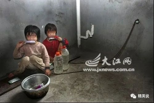 隨後,兩名被鎖女童試圖爬窗被小區工作人員發現。工作人員眼前大為一震,兩名蓬頭垢面的小女孩被兩根1米多長的鐵鏈鎖在房內的水管上,屋內散發着難聞的氣味。而電飯煲內膽中盛着的食物令人“作嘔”,“這根本不像是人吃的東西,孩子們身邊的飲用水也是渾濁的”。