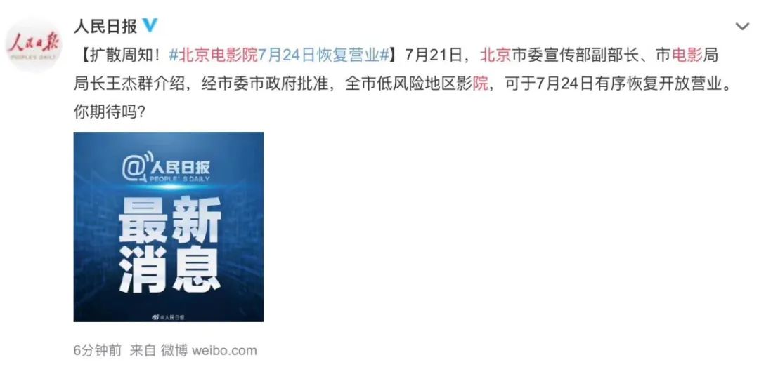 終於,在全國電影院關門近六個月之後,總算盼來了復工的好消息。繼低風險地區電影院7月20日開放營業之後,北京地區的電影院也將於7月24日恢復營業。