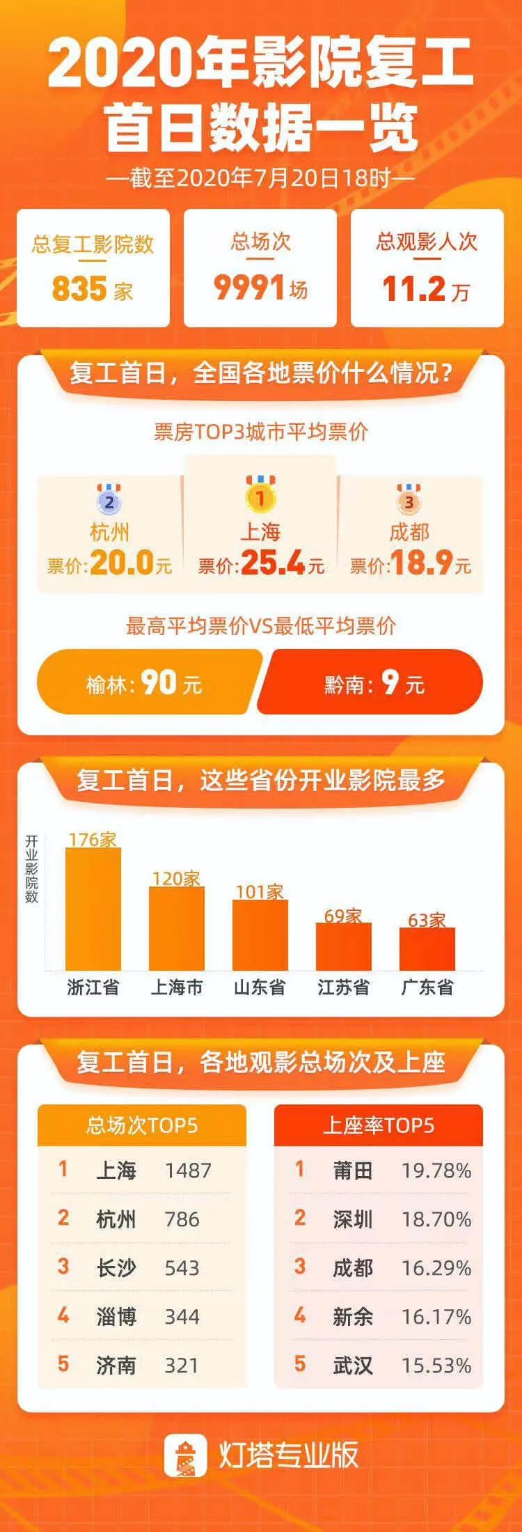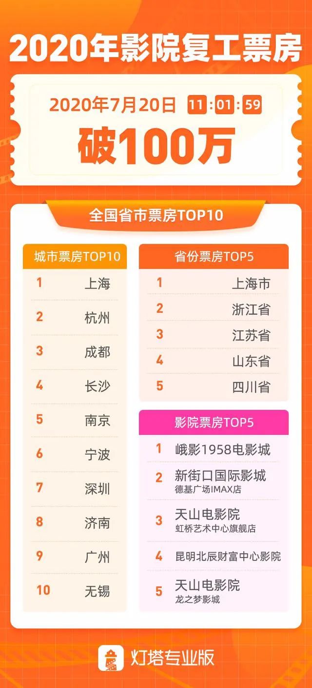 昨日是影院復工的第一天,根據燈塔專業版顯示,11時1分59秒,2020年影院復工票房破100萬。票房排名前五的地區,分別為上海、浙江、江蘇、山東、四川。截至到下午16時,全國復工影院達到了654家,排片場次達到8352場,總出票數6.89萬張,票房達到300萬。
