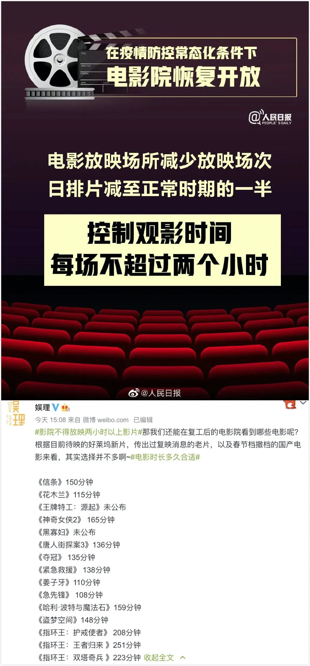 防控指南中還有一個比較大的限制就是,上映電影的片長不得超過兩個小時,也就是120分鐘,限制非常嚴格。然而像《唐人街探案3》《奪冠》《緊急救援》等大片的時長均超過限制,即使片方有心上映也會被120分鐘這隻“攔路虎”攔下。