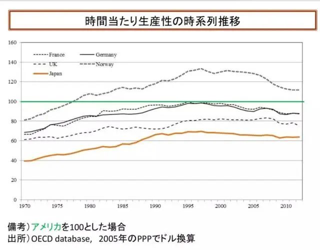 從1970年代到2010年代,日本單位時間的勞動生產率一直遠低於歐美國家。