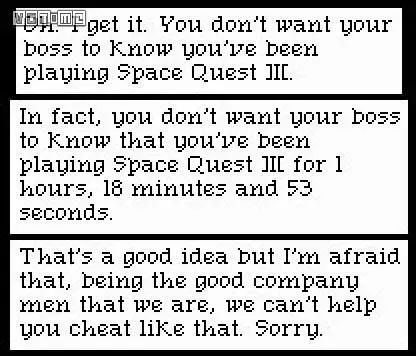 在遊戲《Space Quest III》中,你按下“老闆鍵”,彈出的界面會清楚顯示你的遊(摸)戲(魚)時(鐵)長(證)。