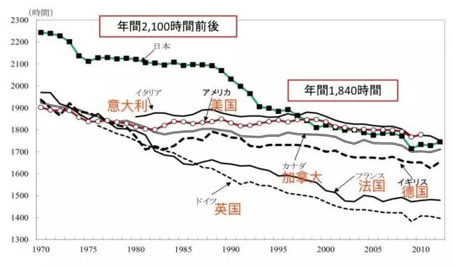 課題顯示,1980年左右,日本勞動者的年工作時長大概是在2100小時左右。當時歐美國家員工的工作時長大概是在1800小時左右。