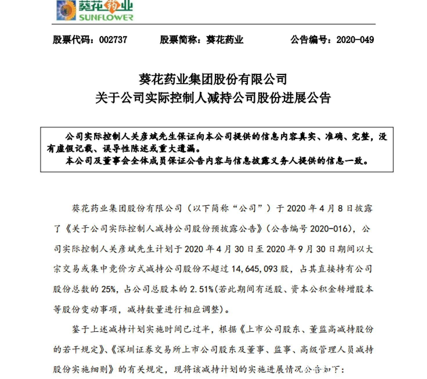 根據葵花葯業2020年7月15日發佈的實控人關彥斌最新減持進展公告,關彥斌計劃於2020年4月30日至2020年9月30日期間以大宗交易或集中競價方式減持公司股份不超過1464.51萬股,佔其直接持有公司股份總數的25%,佔葵花葯業總股本的2.51%。截至2020年7月7日,關彥斌已完成減持583.9951萬股,占上市公司總股本比例達到1%。