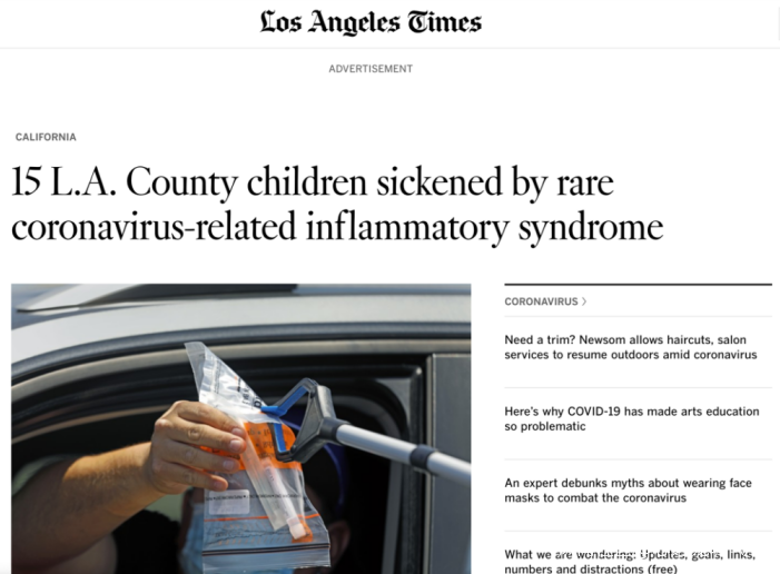 △《洛杉磯時報》稱,洛杉磯縣15名兒童確診與新冠病毒有關的疾病