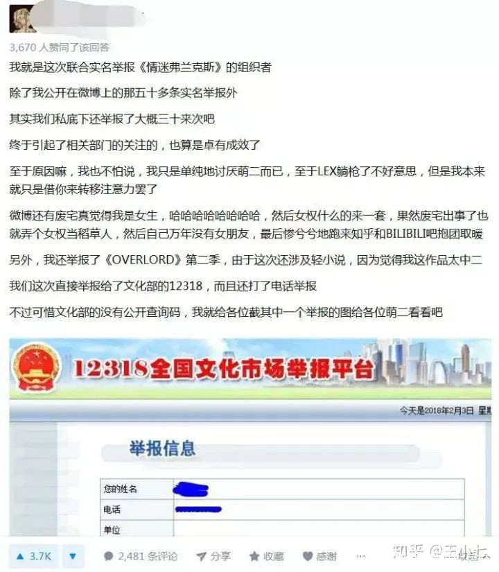 18年《情迷弗蘭克斯》(別名:國家隊)遭惡意舉報,舉報者在該番下架後驕傲地出來宣告自己就是聯名舉報者,稱舉報理由是“單純討厭萌二”;此外還以為作品太中二舉報了《OVERLORD》。