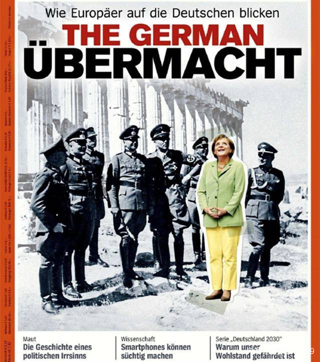 於是,德國《明鏡》週刊自嘲般地刊登了一張拼版照片:默克爾身後是一羣剛剛佔領希臘的納粹軍官,在希臘標誌性建築前合影。