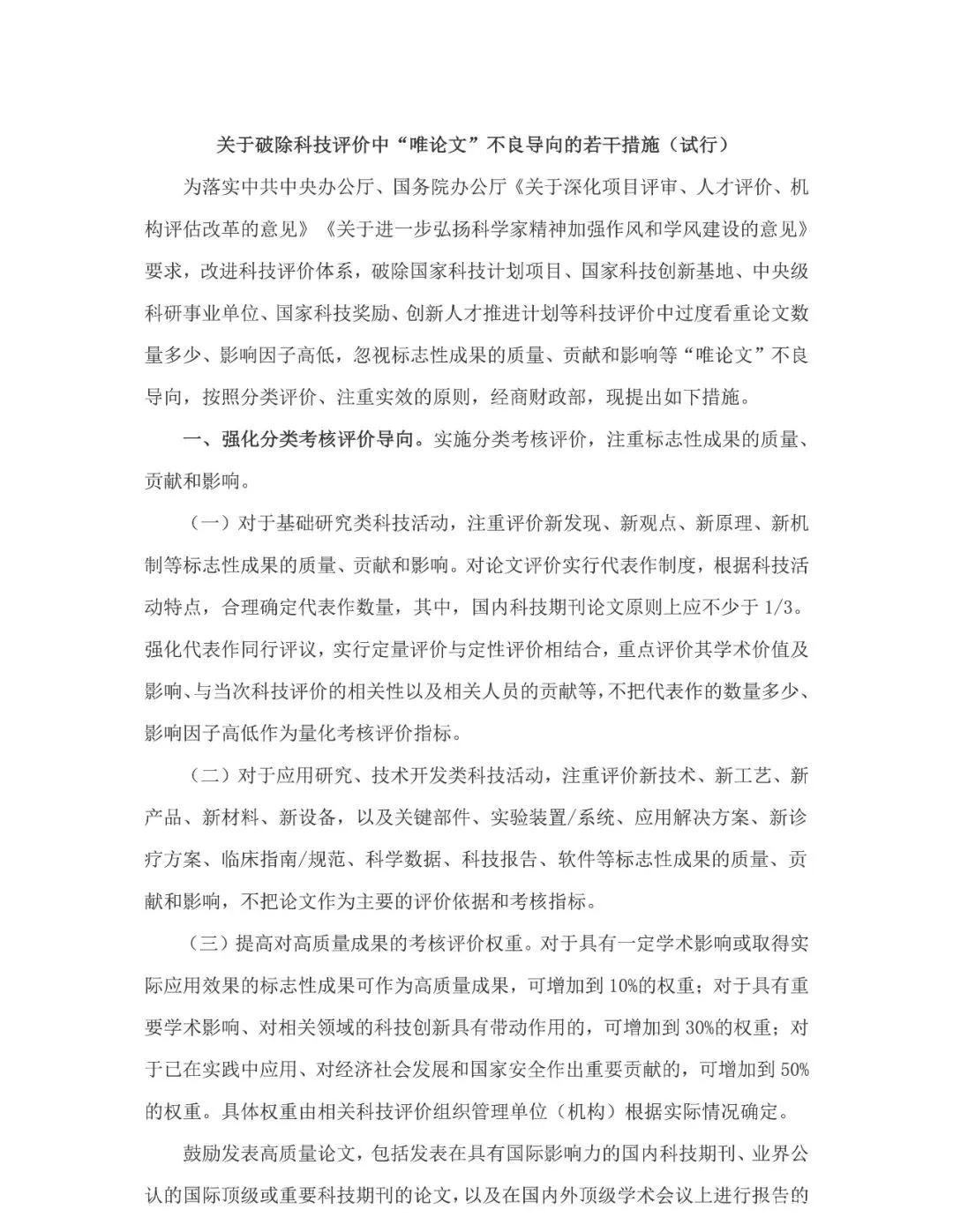 附《關於破除科技評價中“唯論文”不良導向的若干措施(試行)》