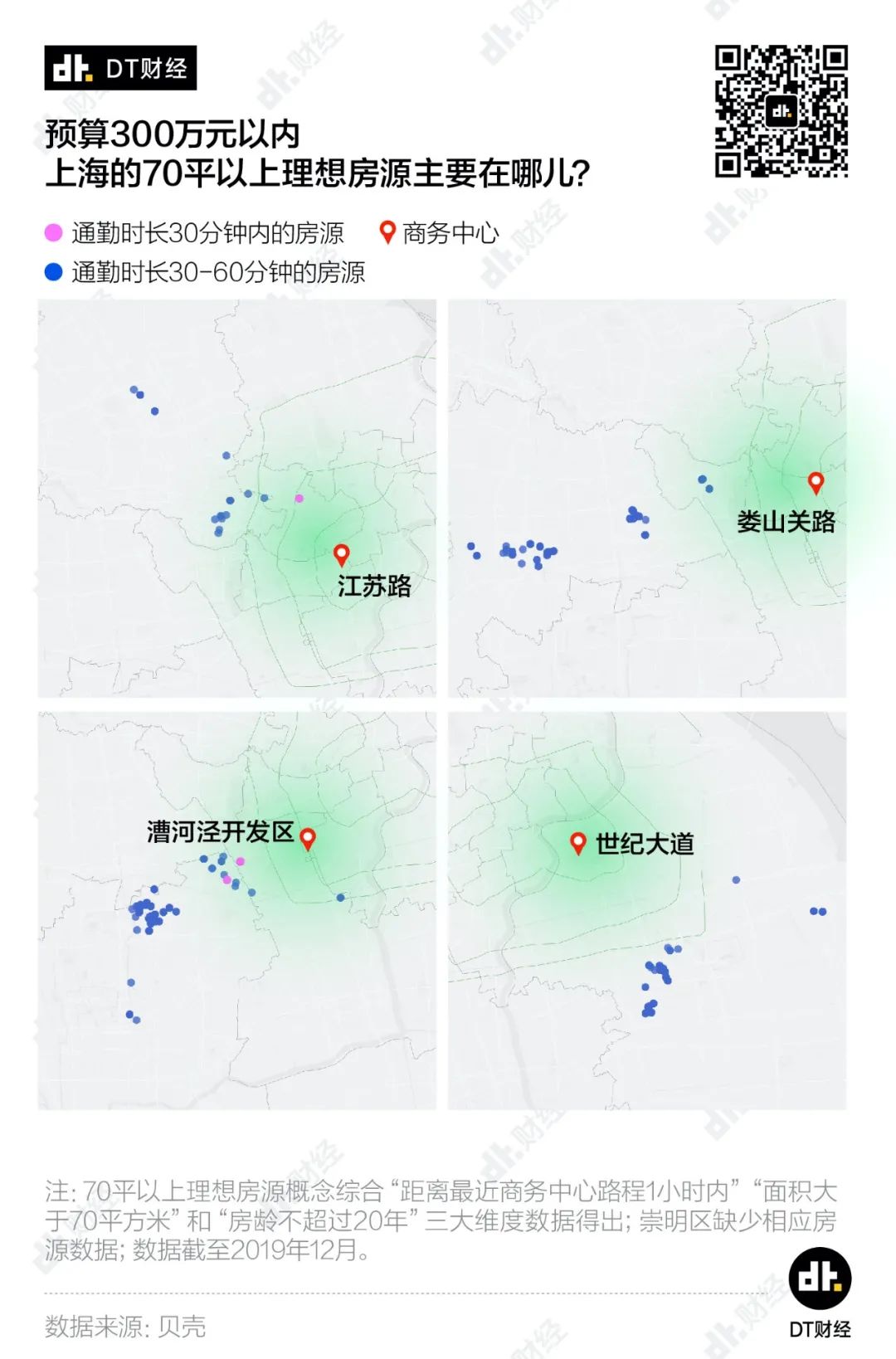在漕河涇開發區的1小時輻射圈內,有365套房子符合“房齡低於20年”“面積大於70平方米”這一系列標準,排名第一。漕河涇西南邊的松江區,包括新橋、泗涇、九亭等板塊,符合標準的房源大多分佈在這裏。
