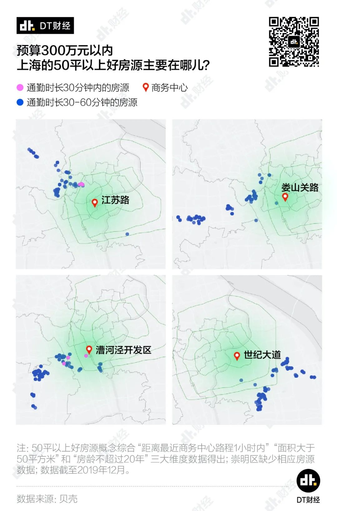 我們詢問了下,小馬現在正好是在漕河涇上班,想要把通勤時間壓縮到30分鐘內,那麼可選擇的300萬房源稍微有點少;如果能接受1小時的通勤——這在大城市也算是平均水平——那麼小馬的選擇將會變得非常豐富。