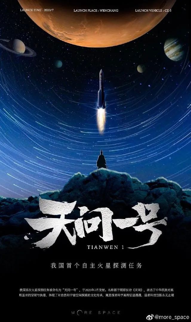 【天問一號】的名字取自我國古代著名詩人屈原的長詩《天問》,在 2000 多年前屈原就對天地分離、日月星辰發出列如【九天之際,安放安屬?】的天問。