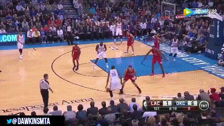 體前變向晃開吉諾比利,右起三分幹拔,注意,這裏KD應用的是合球跳步大傷前的技術動作