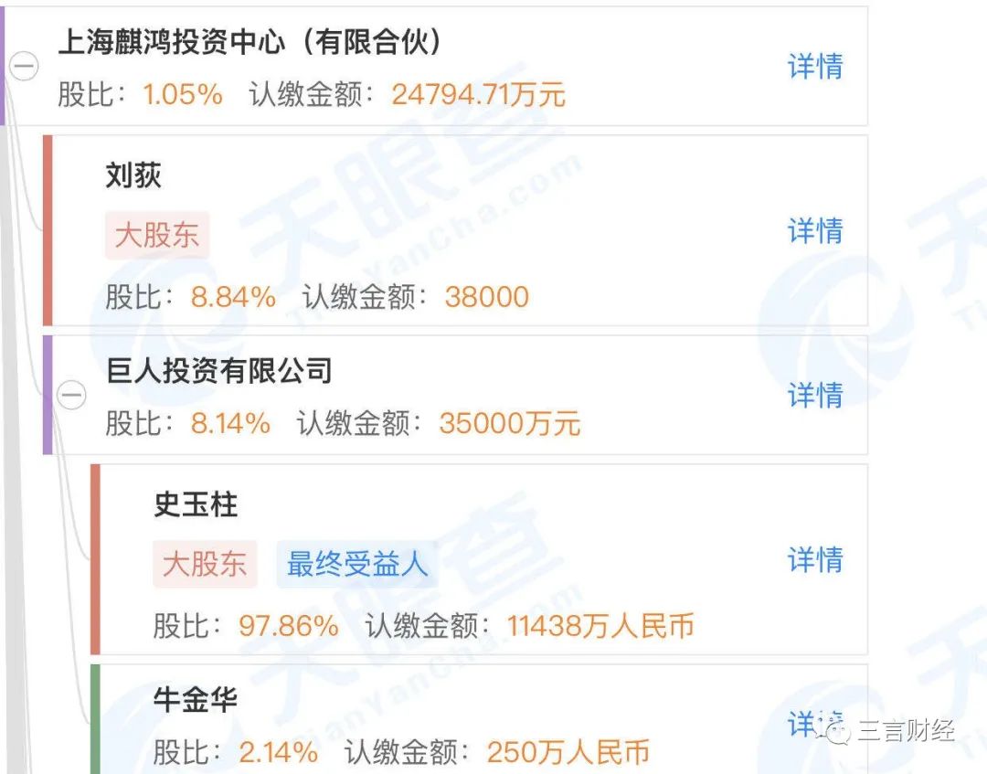 螞蟻集團另外一家股東上海麒鴻投資中心有限公司中,也能看到史玉柱的身影。
