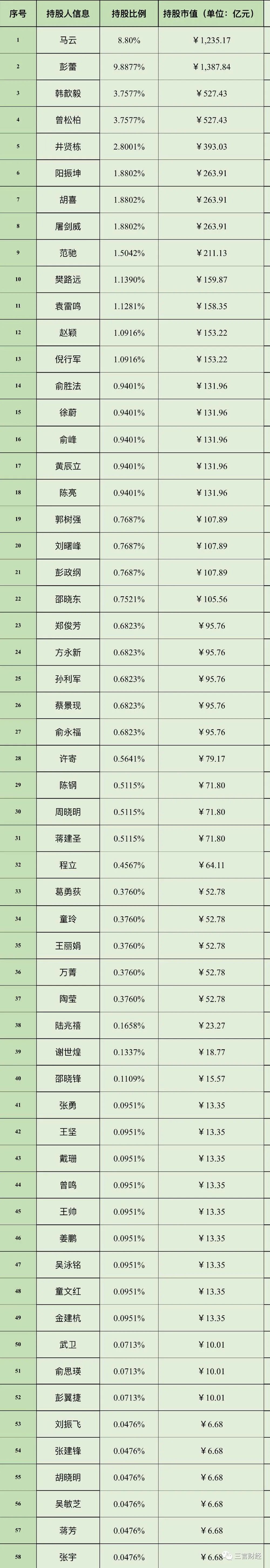 三言財經根據公開信息進行統計, 螞蟻集團上市後,螞蟻和阿里系高管將產生至少產生58位億萬富翁。