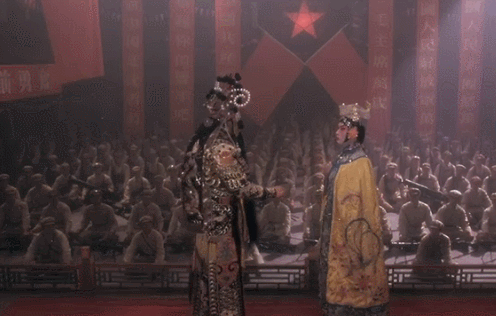 其中有一段表演出現了失誤,程蝶衣當場呆住了,不知所措;而段小樓害怕台下的人,也會像以前的觀眾那樣打罵人,下意識地把程蝶衣迴護在身前: