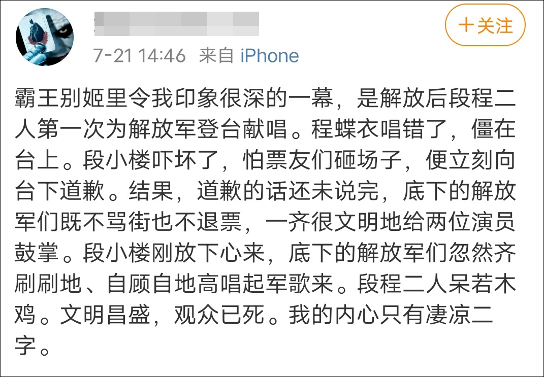 在一個衣食無憂,社會安定的年代,有人從電影場景裏,感嘆出“原來舞台上走幾步都是學問的京劇,如今唱破音依然獲得滿堂彩,是藝術本身的悲哀”。