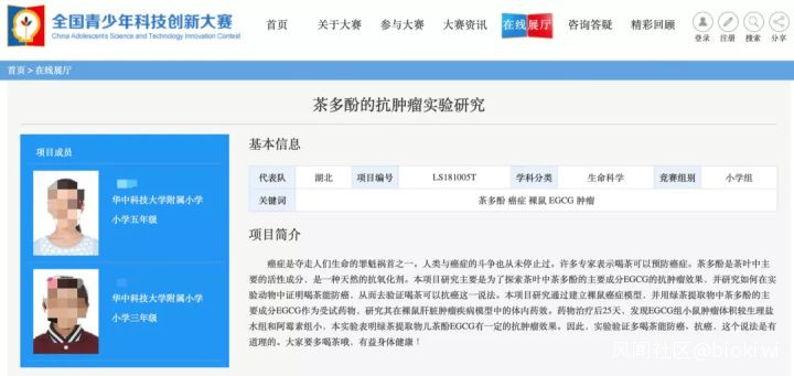 前段時間在小學生研究癌症之後,又有一個全國青少年科技創新大賽獲獎項目受到大家的質疑——“茶多酚的抗腫瘤實驗研究”。