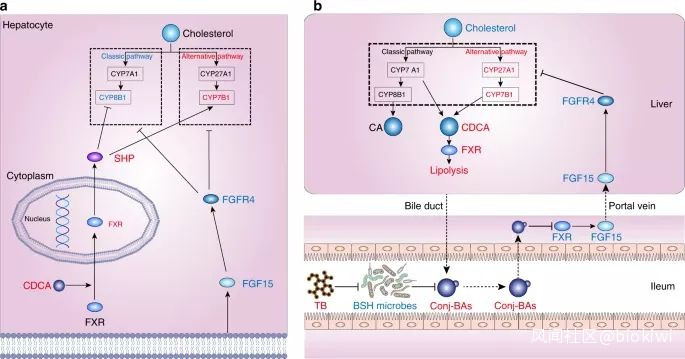 腸道FXR-FGF15信號受到抑制,一來會導致肝臟膽汁酸生成和排遺(便便)增加,肝臟膽固醇含量降低,脂肪生成減少;二來還會增加膽汁酸替代合成途徑,激活肝臟FXR,並促進脂肪分解。
