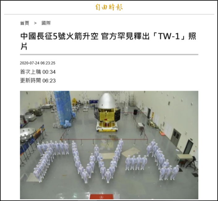 這篇名為《中國長征5號火箭升空,官方罕見釋出“TW-1”照片》的報道提到,在“天問一號”發射成功後,中國航天科技集團發佈了一張照片,圖中,科研人員列隊組成“TW-1”的字樣。