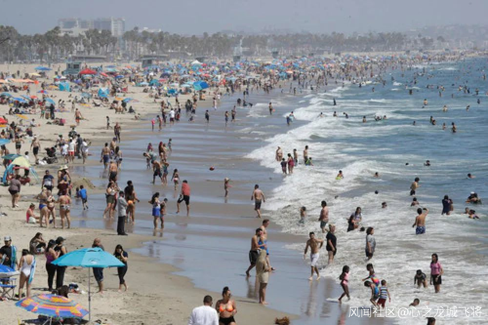 7月12日,人們在美國加利福尼亞州海濱城市聖莫尼卡的海灘上消暑。