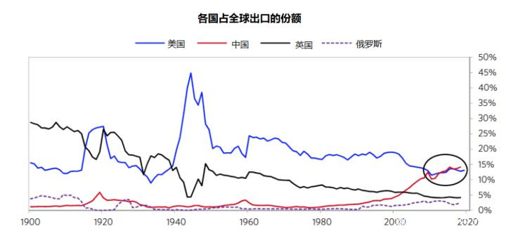 1945年美國的總產出是其他主要國家的數倍,儘管其在全球的佔比有所下降,但仍遠高於其他任何國家,直到最近美國才被中國超過。按非購買力平價計算,中國的總產出約為美國的70%,而且增速明顯加快。最重要的是,美國在1945年是主要的經濟生產國,在過去的100年裏沒有一個經濟競爭對手,直到現在中國已經與美國規模相當。