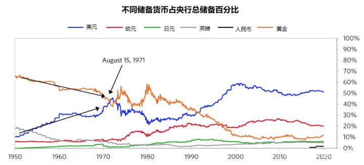 美元佔外匯儲備比例在50%以上。自1945年以來,美元的主要儲備貨幣的地位一直相當穩固,特別是在向法定貨幣體系轉變後,美元取代黃金成為持有最多的儲備資產。