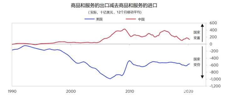 從1990年以來的美國和中國貨物和服務實際差額可以看出,中國經濟在1978年改革開放以及2001年加入世貿組織兩個節點增長迅速。本世紀初到2010年,中國的貿易順差和美國的貿易逆差加速增長。之後,兩國的貿易餘額逐漸縮小,中國仍然趨向於貿易順差,而美國仍然是貿易逆差。