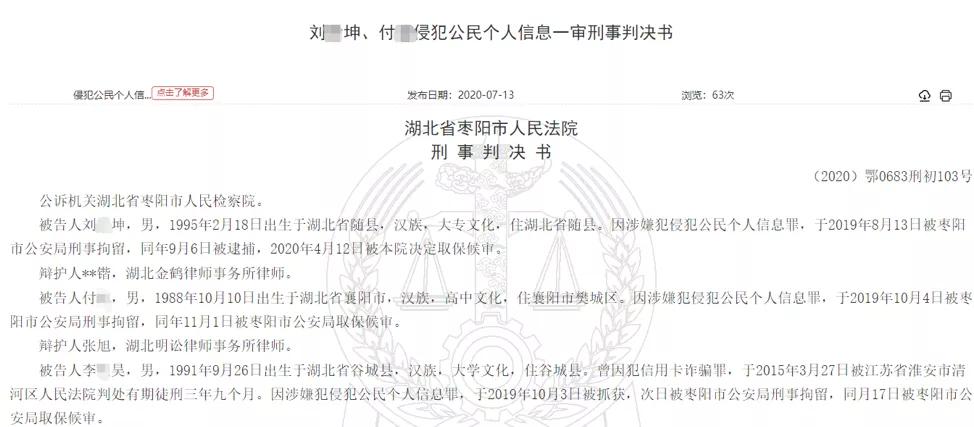 依照《中華人民共和國刑法》、《關於辦理侵犯公民個人信息刑事案件適用法律若干問題的解釋》的相關條例,湖北省棗陽市人民法院判處劉某坤有期徒刑八個月,並處罰金一千元;判處付某拘役五個月,緩刑六個月,並處罰金一千元;判處李某昊有期徒刑七個月,並處罰金一千元。