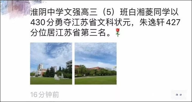 早前,來自淮陰中學校友羣的消息稱,該校應屆生白湘菱以430分的成績勇奪江蘇省文科狀元。