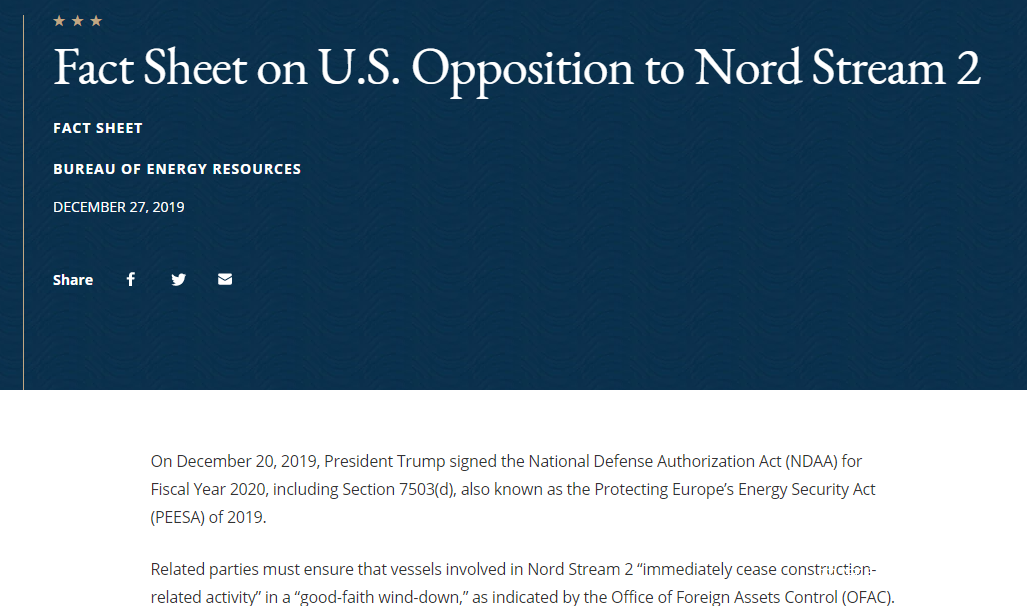 此前,在美國2020財年國防預算案中,相關制裁以《保護歐洲能源安全法案(2019)》的形式出現。