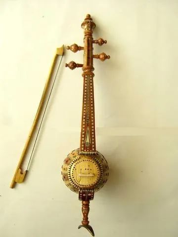 ▲圖中右邊音箱為半球形,以動物皮蒙面,琴頸細長,頂部彎曲的樂器就是它啦~