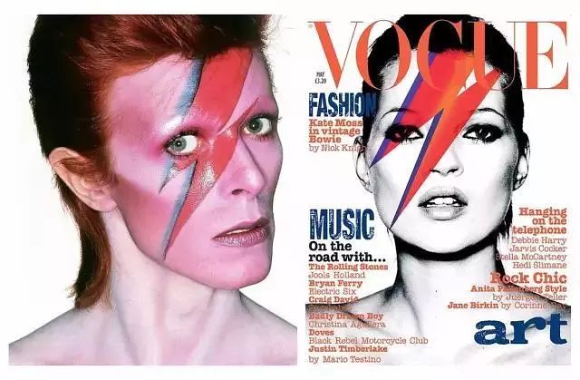 他的標誌性橘色長髮,緊身褲,厚底鞋,讓人雌雄難辨。在舞台上,他可以是色彩繽紛的連身衣,踩着高跟鞋,名為“Ziggy Stardust”的一箇中性外星怪物。而在現實中,他是“無性別”的時尚先鋒,他創造出的閃電妝、太陽妝被爭相模仿。