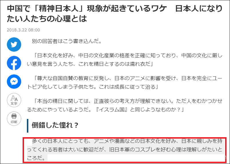 大意為:倒錯性的憧憬?大多數日本人對喜愛動漫等日本文化的年輕人持歡迎態度,但即便如此,熱衷於cosplay舊日軍,在他們( 日本人)看來也是一種難以理解的行為。