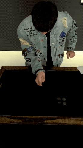 之後周杰倫乾脆把紙牌拿走,在桌子上簡單揮動手臂,桌子上的硬幣就開始形成各種各樣的圖案,有數字、甚至還有硬幣組成的心形圈。
