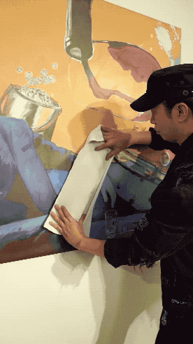 而陳冠霖則用絲巾罩住畫上的香檳,一轉手香檳突然出現在了他的手中。