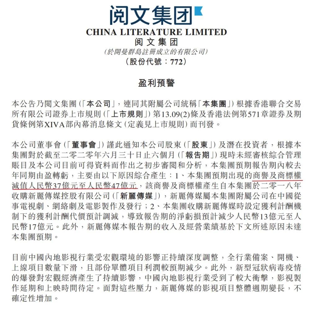 7. 閲文預計上半年虧損,計劃對新麗傳媒商譽減值37億-47億元