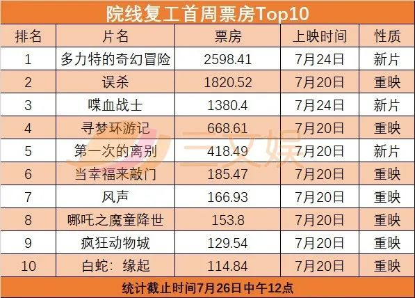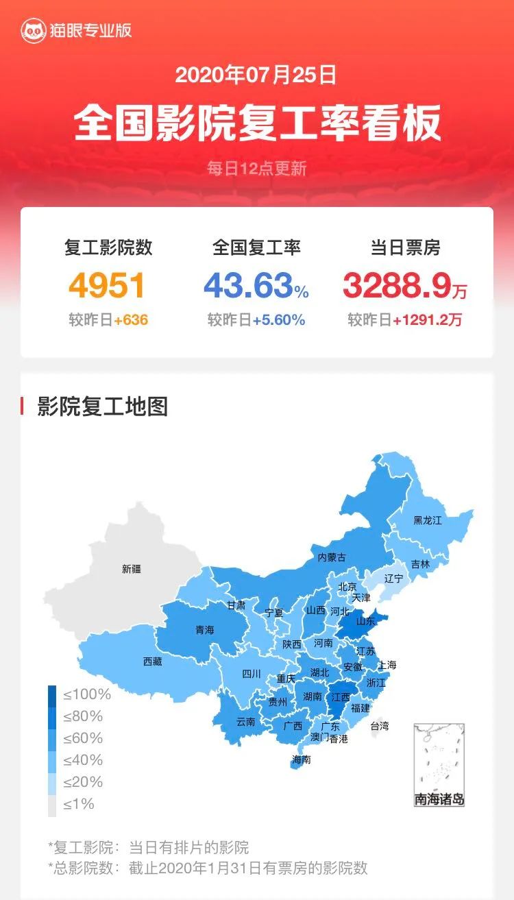 根據貓眼的“全國院線復工看板”,截至7月25日中午12點,全國共有4951家院線復工,復工率43.63%。截至7月26日中午12點,本週累計票房8510萬。