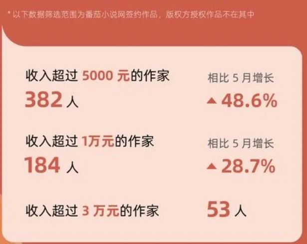 根據報告,番茄小説旗下月入5000元以上的作家有382人,環比增長48.6%。月入過萬的作家有184人,環比增長28.7%,月收入超過3萬的作家有53人。這部分收入主要和讀者數量、閲讀時長、廣告展現次數掛鈎。
