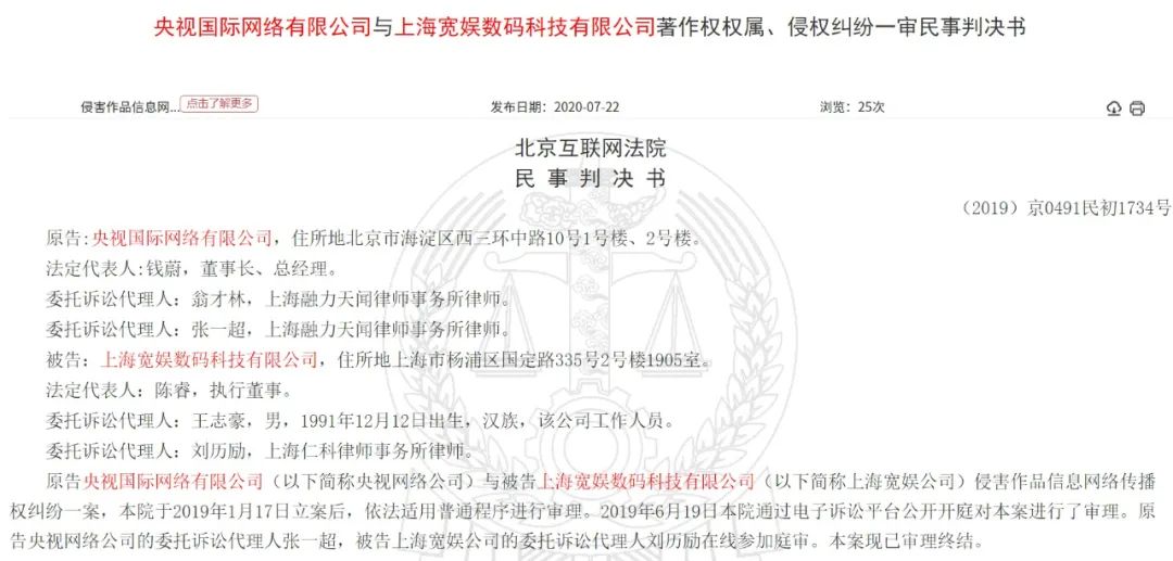 7月22日,裁判文書網公佈了《央視國際網絡有限公司與上海寬娛數碼科技有限公司著作權權屬、侵權糾紛一審民事判決書》。