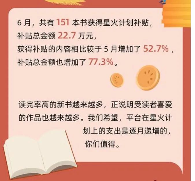 另外番茄小説自20202年5月開始推出星火計劃,這是一個補貼激勵計劃,主要根據作品的讀完率發放現金補貼。6月,一共有151本書獲得星火計劃補貼,獎金累計22.7萬元,平均一本補貼1503.3元。補貼的作品環比增長52.7%,補貼金額環比增長77.3%。