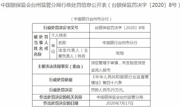 台州銀保監局披露的罰單顯示,中國銀行台州市分行因貸後管理不審慎,未發現信貸資金流入股市,銀保監會台州監管分局對其予以罰款25萬元。